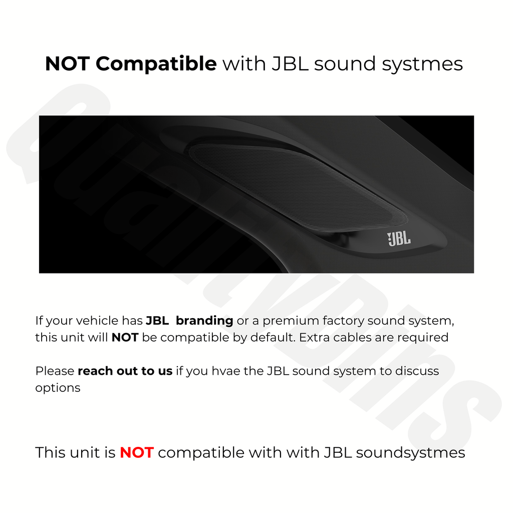 Not compatible with vehicles equipped with the JBL sound system by default | Reach out to us if you have the JBL sound system to discuss options.